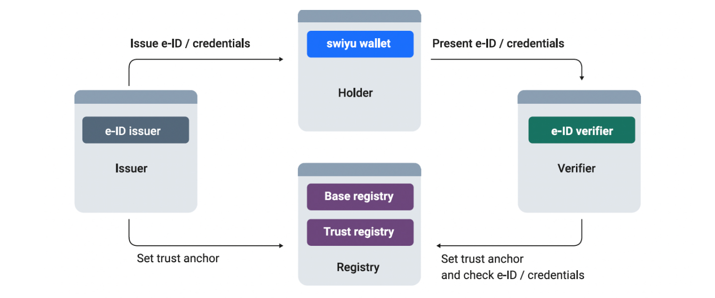The Federal Office of Information Technology, Systems and Telecommunication (FOITT) provides the “swiyu” mobile app for Android and iOS to receive, store and present the e-ID and other verifiable credentials. This app is already available in the usual app stores. Storing the e-ID in the swiyu wallet on the holder’s personal device means that no central data storage is necessary. The link to the holder is established by generating cryptographic key material in the secure element of the smartphone during the application process. This means that the holder’s private key cannot be easily copied, provided the secure element components do not contain any security vulnerabilities. Once a recognition process and the technical requirements have been established, the Federal Council can authorize issuance in third-party wallets. When a holder presents the e-ID for identification, the verifier needs a counterpart to check its validity and the correct issuer and to ensure that the e-ID presented has not been altered. This takes place through a signature check by the verifier using the public signature key of the e-ID issuer. For this purpose, the issuer registers its public signature key in the base registry. With a request, the verifier can retrieve the public signature key from the base registry and carry out the signature check without leaving any data traces about the use of the e-ID on the issuer’s side. The link between the issuer’s technical entry in the base registry and the real identity of the issuer of the e-ID (fedpol) is entered in the trust registry on request. Verifiers can request this information from the trust registry when checking the e-ID. Both the base registry and the trust registry are provided and operated by the FOITT.