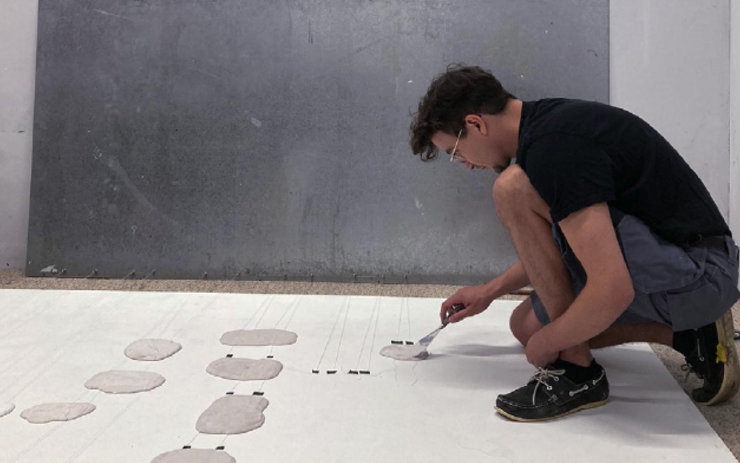 For the casts, I need a smooth and solid surface. All of the exhibited works were cast on a mirror. I first paint on the surface, with the consistency of the paint having a major influence on the final image. I use different black paints, which may look similar but react very differently to the casting material, which consists of either plaster or a calcium sulfate mixture. During casting, movements emerge that are captured – pigments drift apart, dissolve, and recall tectonic and spherical dynamics.