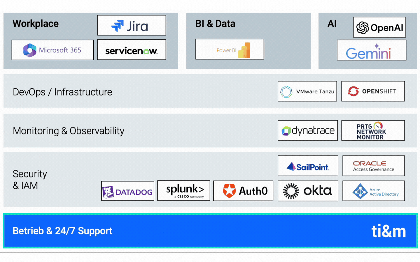 The ti&m Open Source Stack covers all the key areas of infrastructure and platform software.