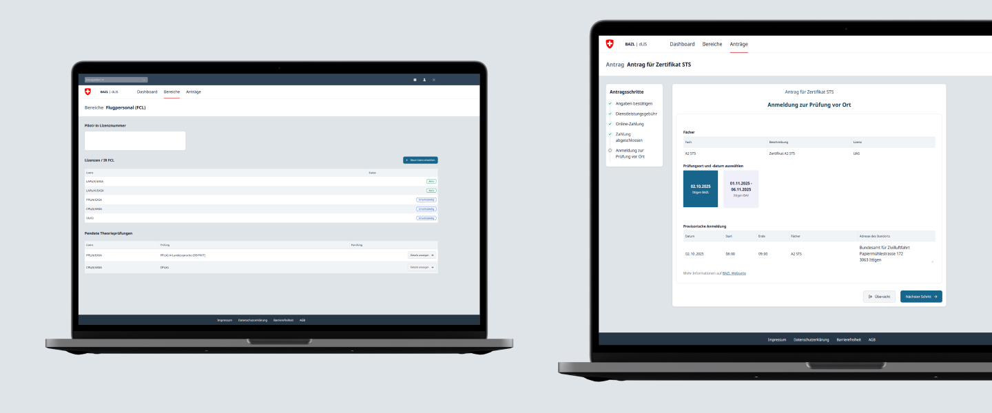 The FOCA has fully digitized these processes with the dLIS digital licensing system: From registration, training, and examination to payment and the issue of certificates, every step is carried out without any media discontinuity. The first part went live at the end of 2024 and enabled drone pilots to apply for certificates online. Since then, new functions have been continuously added, such as payment options or the automated booking of appointments for theory examinations. The service has been gradually expanded to include further processes for additional target groups.